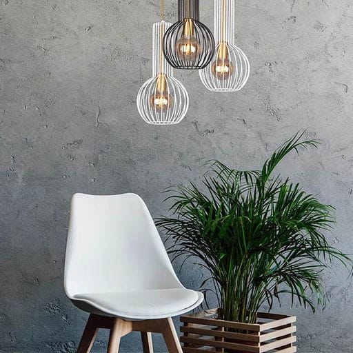 Oryginalne klosze o otwartej budowie zwisają z okrągłego mocowania naśladując spiralę. Długość każdej z linek można również regulować według własnych upodobań.