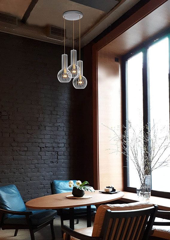 Oryginalne klosze o otwartej budowie zwisają z okrągłego mocowania naśladując spiralę. Długość każdej z linek można również regulować według własnych upodobań.